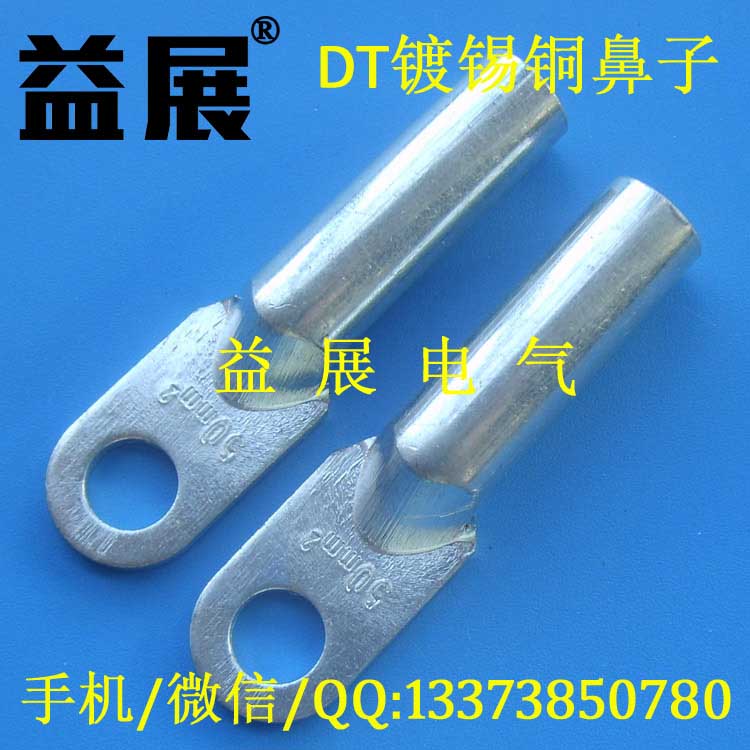 銅鼻子又稱銅管鼻,是用于電線電纜連接到電器設備上的連接件, 材質一般為T2紫銅車制,也有黃銅的, 產品外貌為鍋鏟圓頭, 頂端這邊為固定上螺絲邊,末端為上剝皮后的電線電纜銅芯,品種分為堵油式和管壓式,堵油式較好,為了抵御空氣氧化,又有鍍錫即在銅鼻子表面鍍上一層錫,用以防止其氧化,變黑,大于10平方的才使用銅鼻子,小于10平方的電線不使用銅鼻子,改用冷壓線鼻。銅鼻子有表面鍍錫和不鍍錫管壓式堵油式之分。 DT銅鍍錫接線端子就是在原來DT銅接線端子的基礎上,在表層鍍上一層"錫",增強DT銅端子的導電能力。